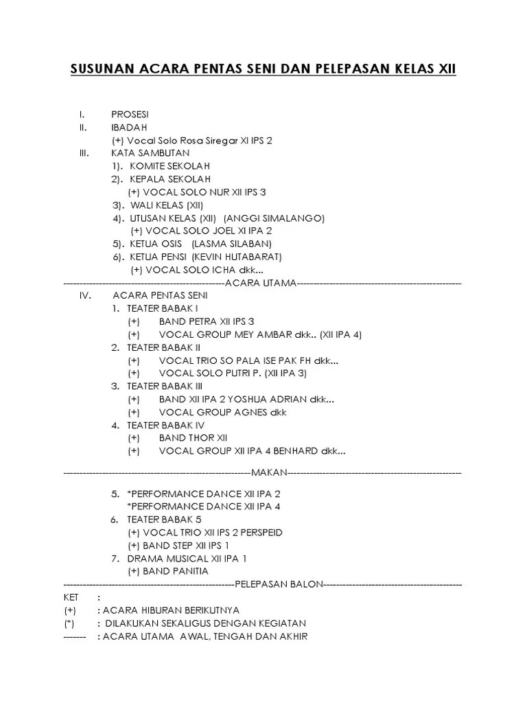 Adapun susunan acara dalam kegiatan pentas seni (pensi) sma negeri 10 malang adalah sebagai . Laporan pertanggungjawaban ketua pentas seni kelas x4 4. Contoh susunan acara perpisahan sekolah madrasah lengkap dan terbaru. Susunan acara pelepasan dan pentas seni siswa siswi angkatan ke vii tk al huda senaung kecamatan jambi luar. Penyerahan hadiah untuk siswa berprestasi;